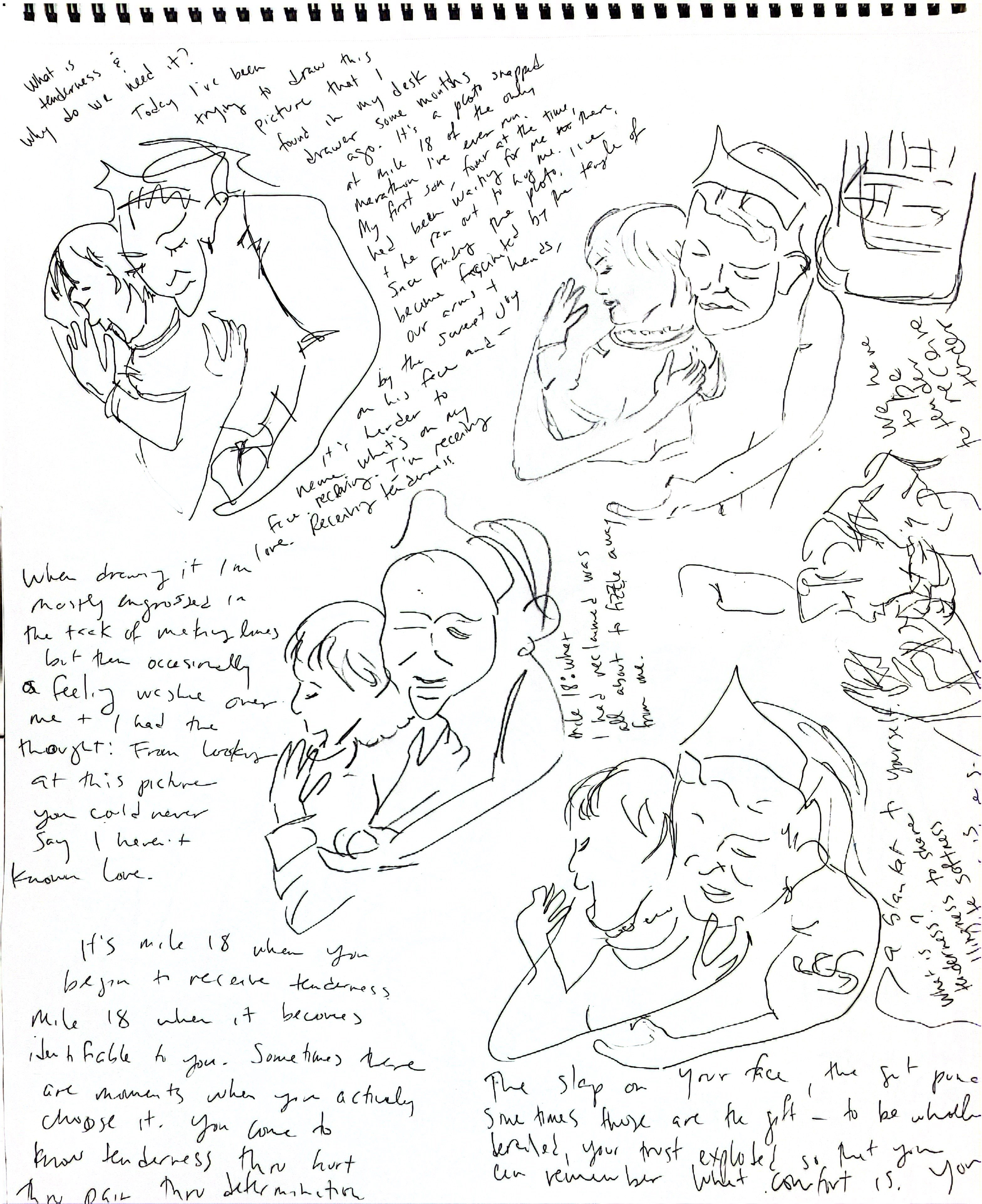 It’s a photo of my three-year-old son hugging me at mile 18 of a marathon. It was the only full marathon I’ve ever run. There are many things I love about the photo, but the main reason I wanted to draw it is that I’ve become fascinated by hands and arms in photographs, fascinated by what we do with them when we’re self conscious and posing, fascinated by how we hold ourselves when we’re candid and awkward or candid and confident.