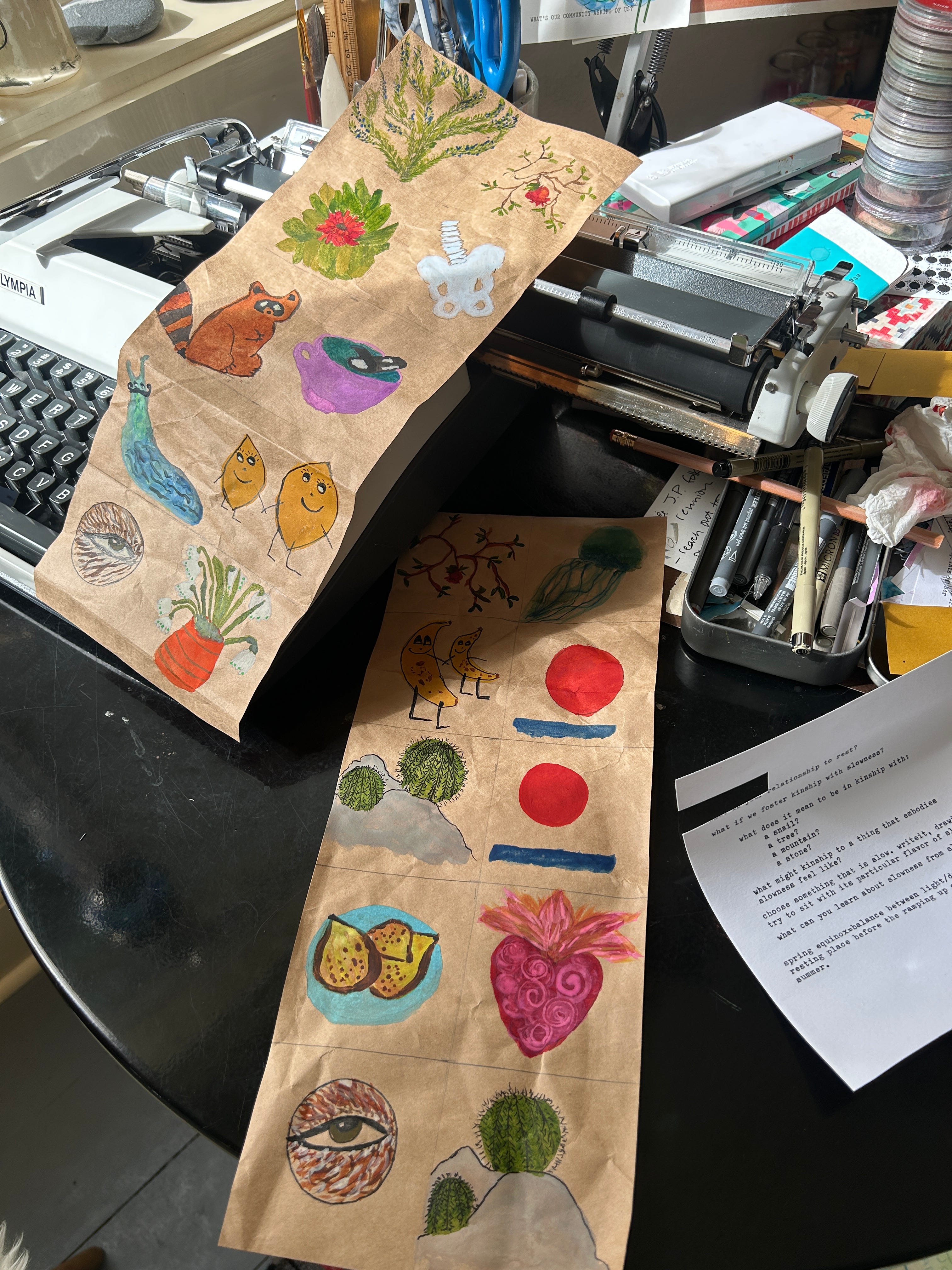 I spent much of yesterday moving between the digital work of wrapping up our Kickstarter page and making my own analog tokens. The reason I am writing in coherent sentences today is because I took breaks from my computer’s screen and spent time with my typewriter, glue, and watercolors. Never before have I felt the power of joyful practice than over the last few weeks, while Jenn and I have been swimming in the current of the analog-digital estuary. I’m not sure how Canva manages to eat a day in one gulp, but oh my gods, when did 11am become 5pm?!?!