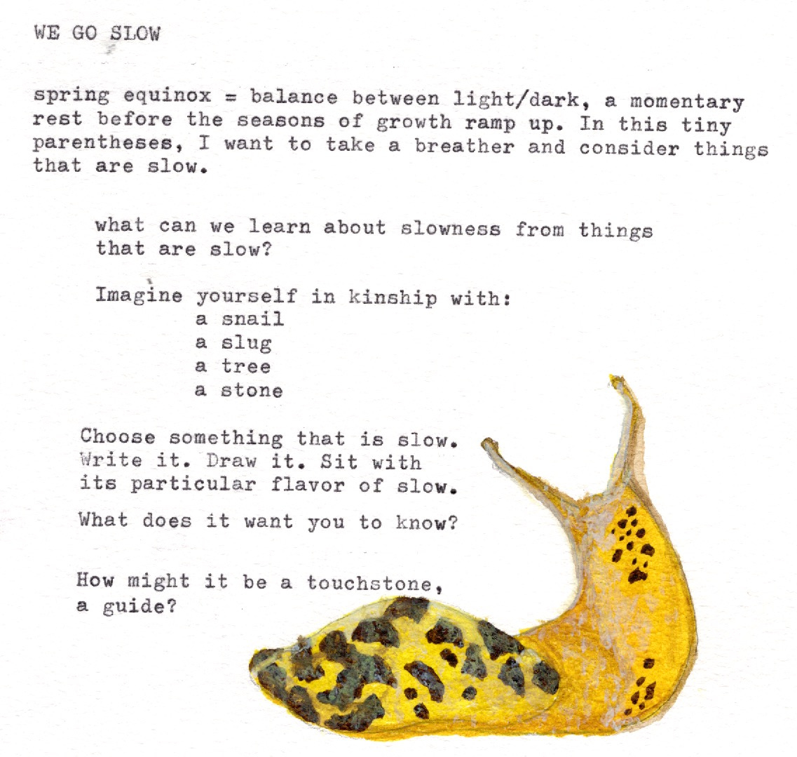 The other day I told our Joyful Practice workshop community that I create the prompts I need. I created this prompt in honor of the spring equinox and as a reminder that even when things get busy, I can seek kinship in the slow things of the world. In fact, I have no choice but to go slow. Living with chronic illness means that if I don’t slow down when my body tells me to, my body will find a way to make me slow down.