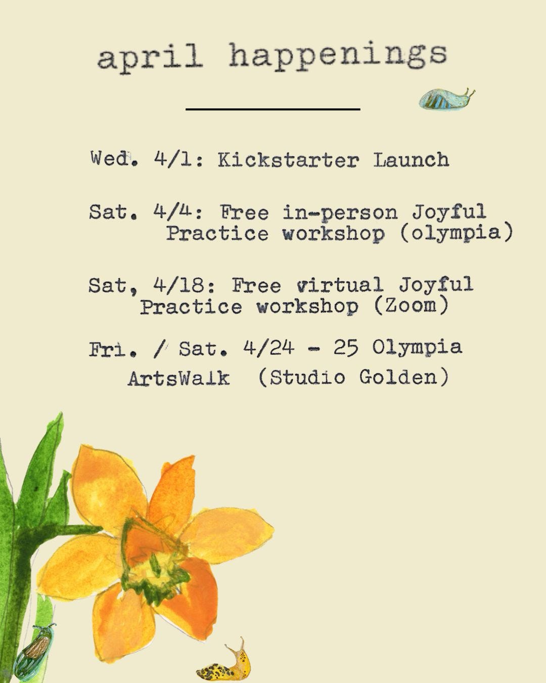 This is why, during the month of April, we are facilitating a series of community events. We want to stay connected to the spirit of our work. Our goal is to keep the joy in joyful practice while we dip into fundraising and promotions. We hope that you can join us for a live event in Olympia or a virtual event over Zoom.